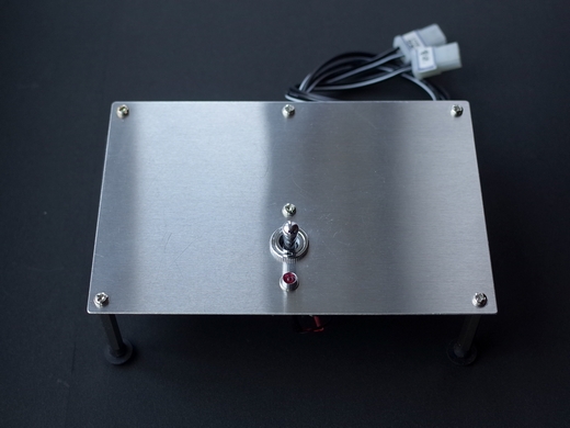 工作としては、アルミ板上部に、スイッチ、LEDパイロットランプを付け、下部にタカチの単3×4本用電池ボックス MD-4B を2個を吊り下げた。天板だけで恰好が悪いが、電池交換は容易だ。スイッチが立派過ぎだが、手持ちの部品を使ったので。