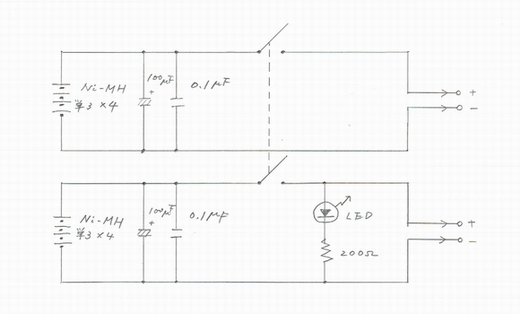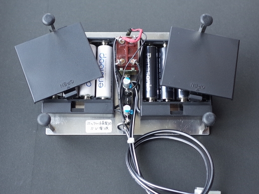単3×4本を2組、スイッチ、LEDパイロットランプ、という構成にした。独立したバッテリー電源2回路と贅を尽くした!? おまけとして、安定化、ノイズ吸収のため、コンデンサーも並列。
