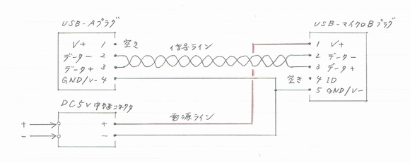 別稿のUSBケーブルの自作記事で、外部電源を使う「短・単・離」型を紹介した。これと同じものを、USB-マイクロB コネクタで自作する。