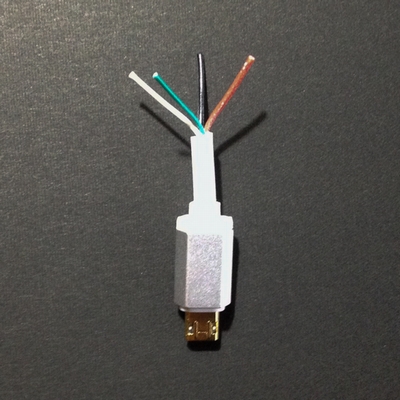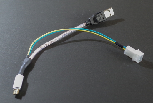 以前のミニBコネクタでの経験からして、さらに小さいマイクロB コネクタとなれば、素人の私にはとてもハンダ付けできない。既成のマイクロB USBケーブルを購入し、コネクタの根元で切断して、導線同士をハンダ付けする方法をとった。反対側のUSB-Aコネクタは、ハンダ付け。短い時間で15cm長のケーブル1本ができた。